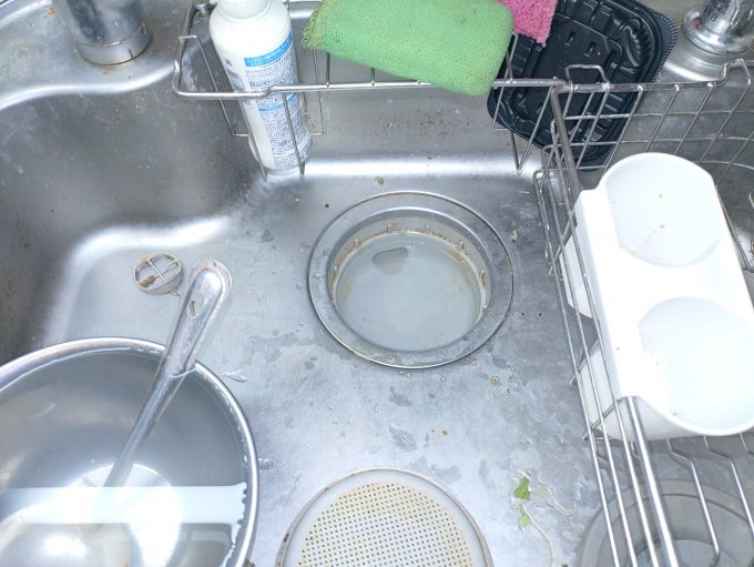 築20年前後、台所排水の流れが数日前から悪く、スポンジで掃除をしていたところ、完全に水が流れなくなったとのことでした。