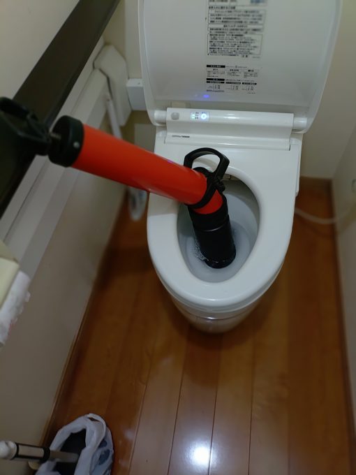 数時間前に子供が使った後より、便器内の水が流れなくなり色々と試してみたが改善しないため、修理作業見積もりを依頼されたとのことでした。
